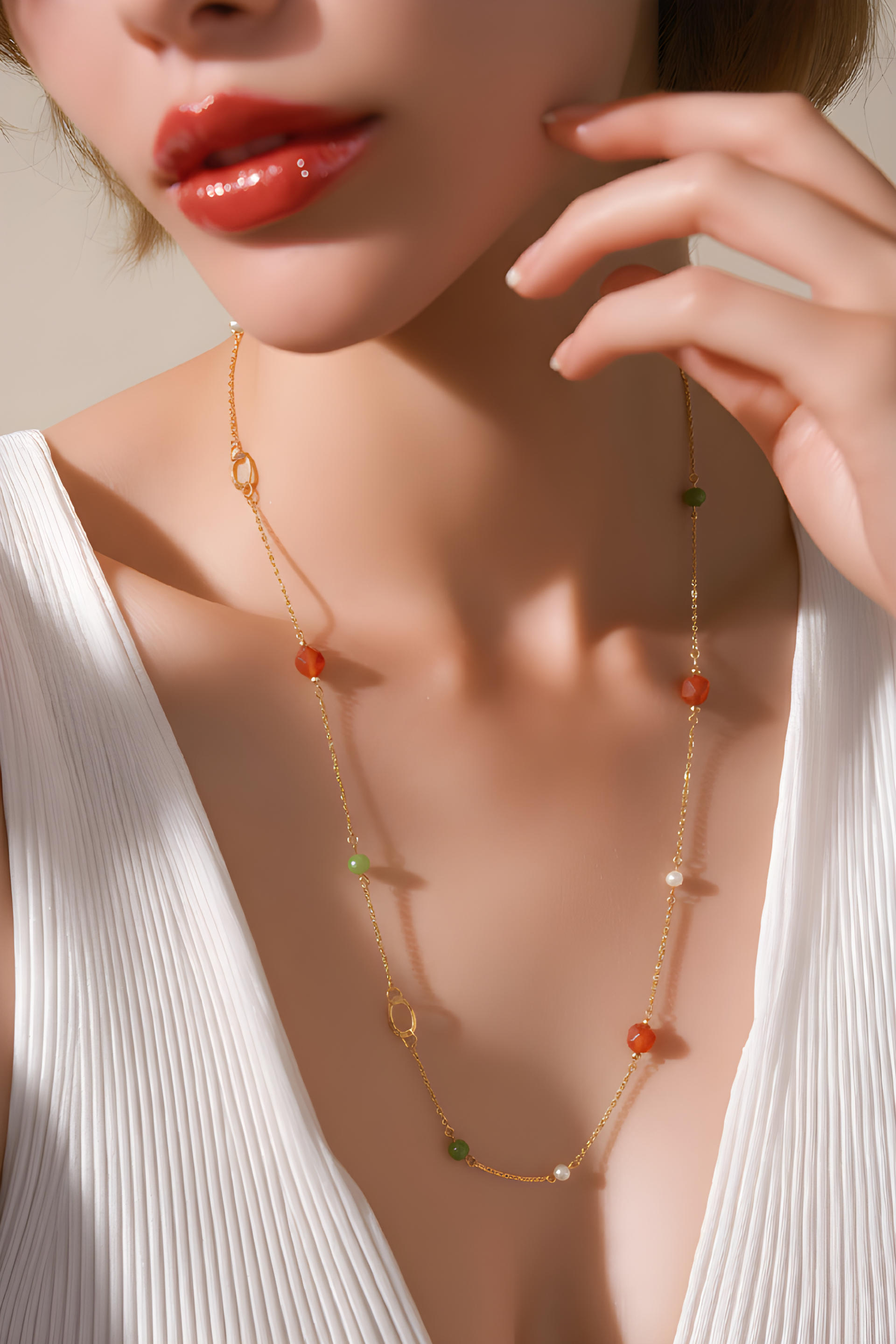 Collier-sautoir en pierres naturelles , [cornaline, perles d'eau douce blanche, peridot ], anneau martelé en acier inoxydable dorée, chaîne en acier inoxydable doré 304🌹, fait main, Valy's Jewelry 🌺