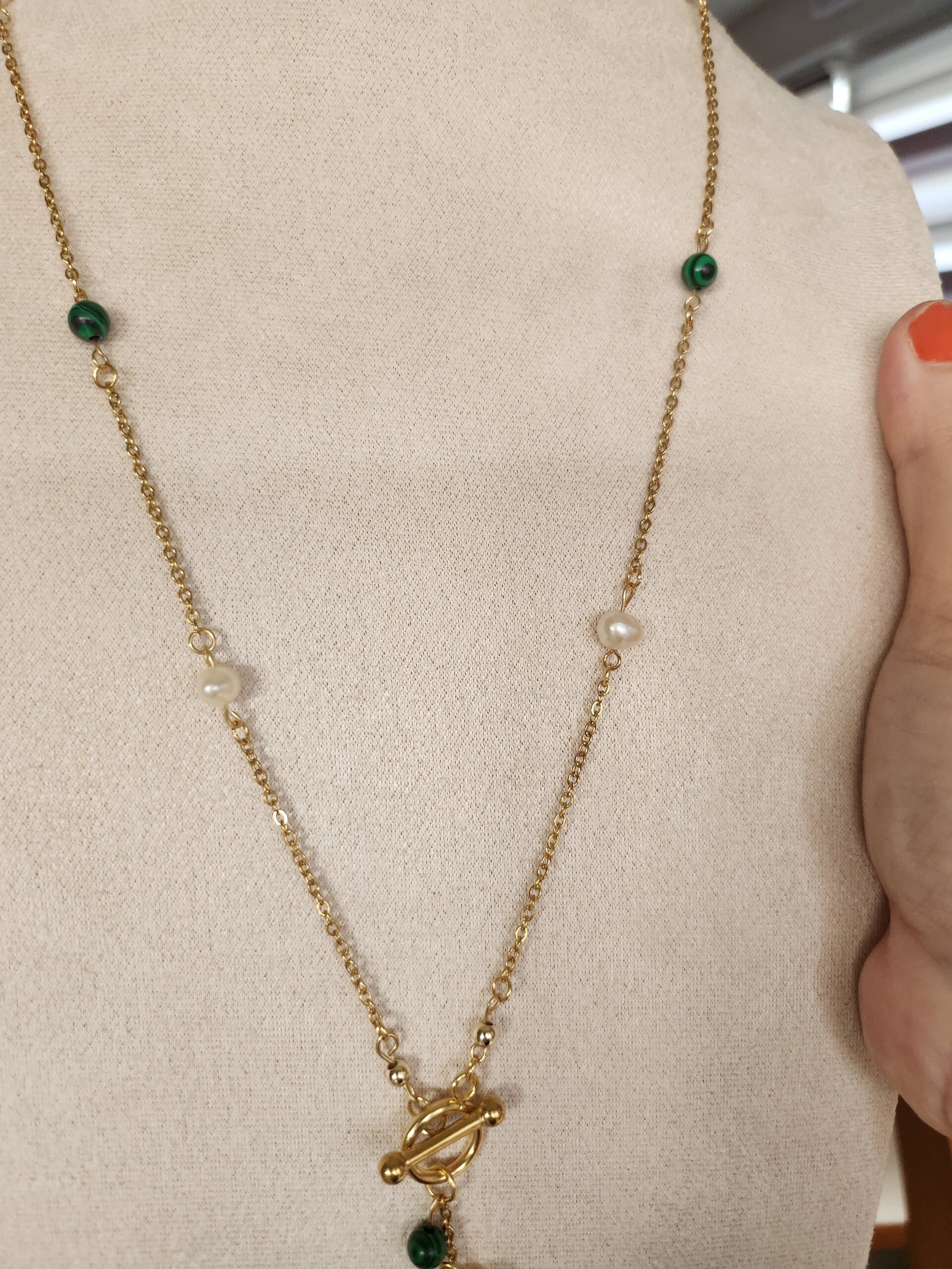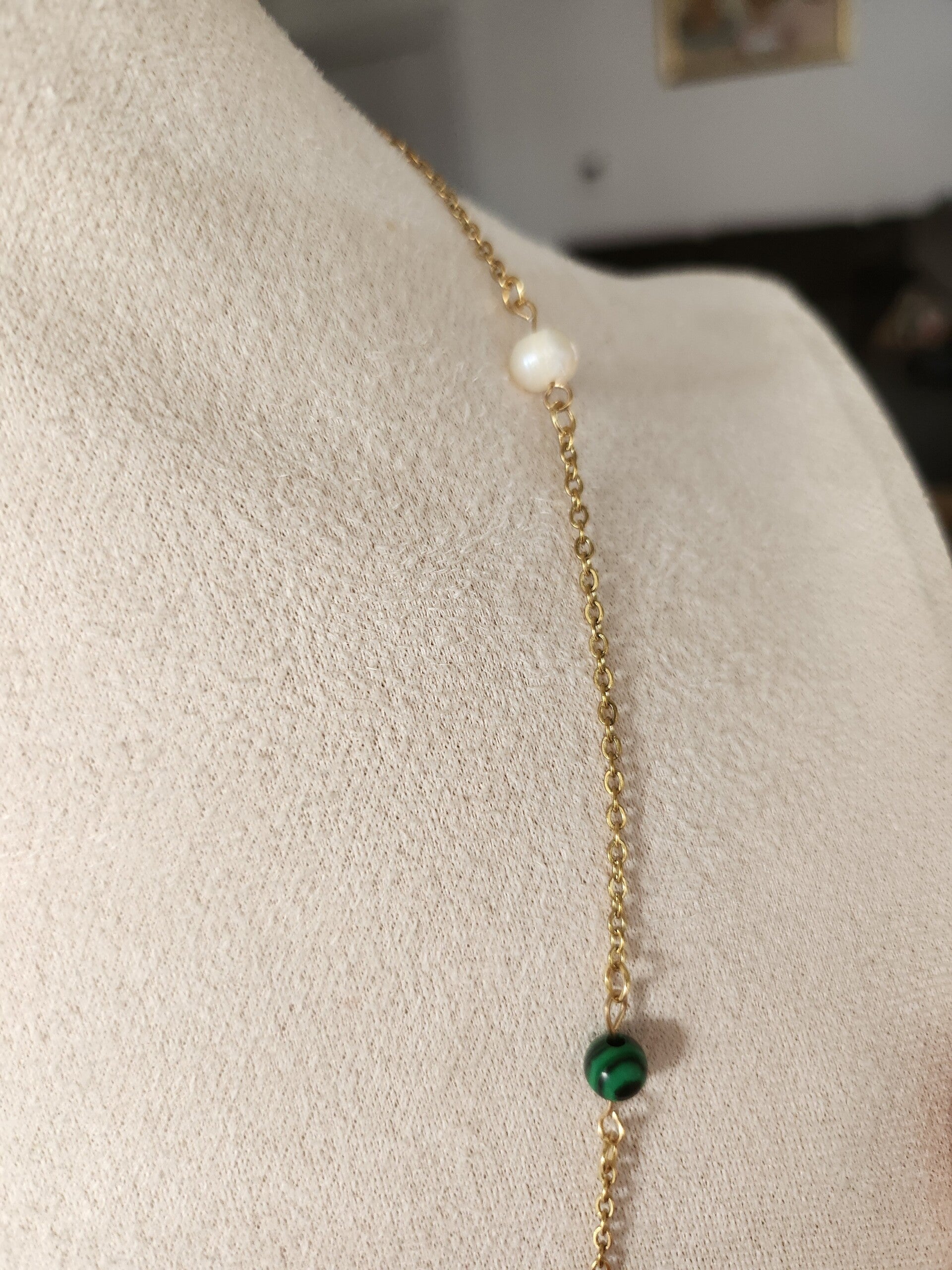Ce collier est orné de perles d'eau douce véritables et de malachite, enveloppées à la main sur une chaîne forçat délicate en acier inoxydable 304. Le collier se ferme à l'avant par un fermoir en T en acier inoxydable 304. Le collier est réalisé par mes soins.