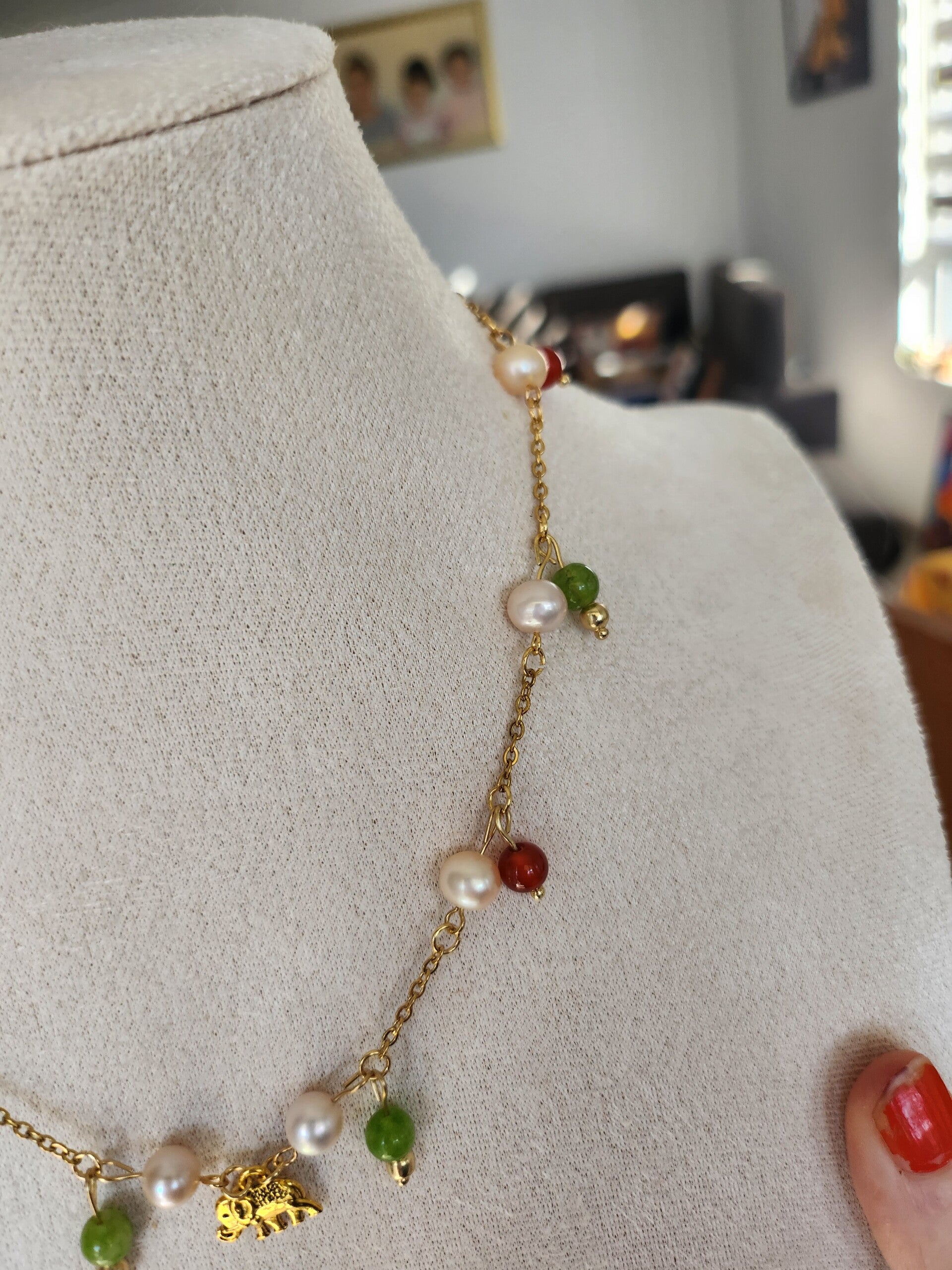 Collier et ses perles naturelles 🌹 [ cornaline, peridot, perles de culture d'eau douce, couleur crème. ], pendantif éléphant en acier inoxydable Doré, chaîne en acier inoxydable 304 doré , fait main, "valy's Jewelry "