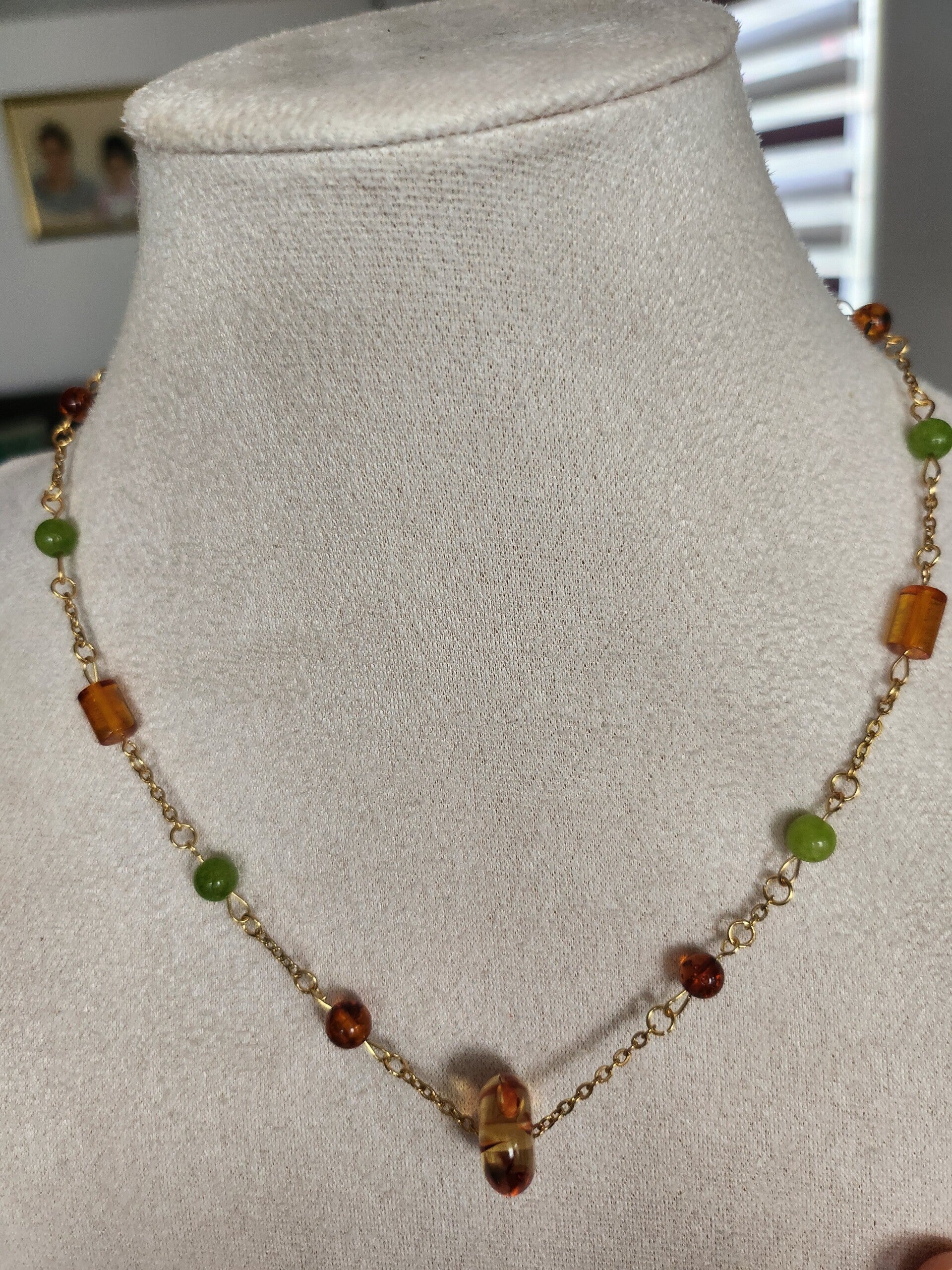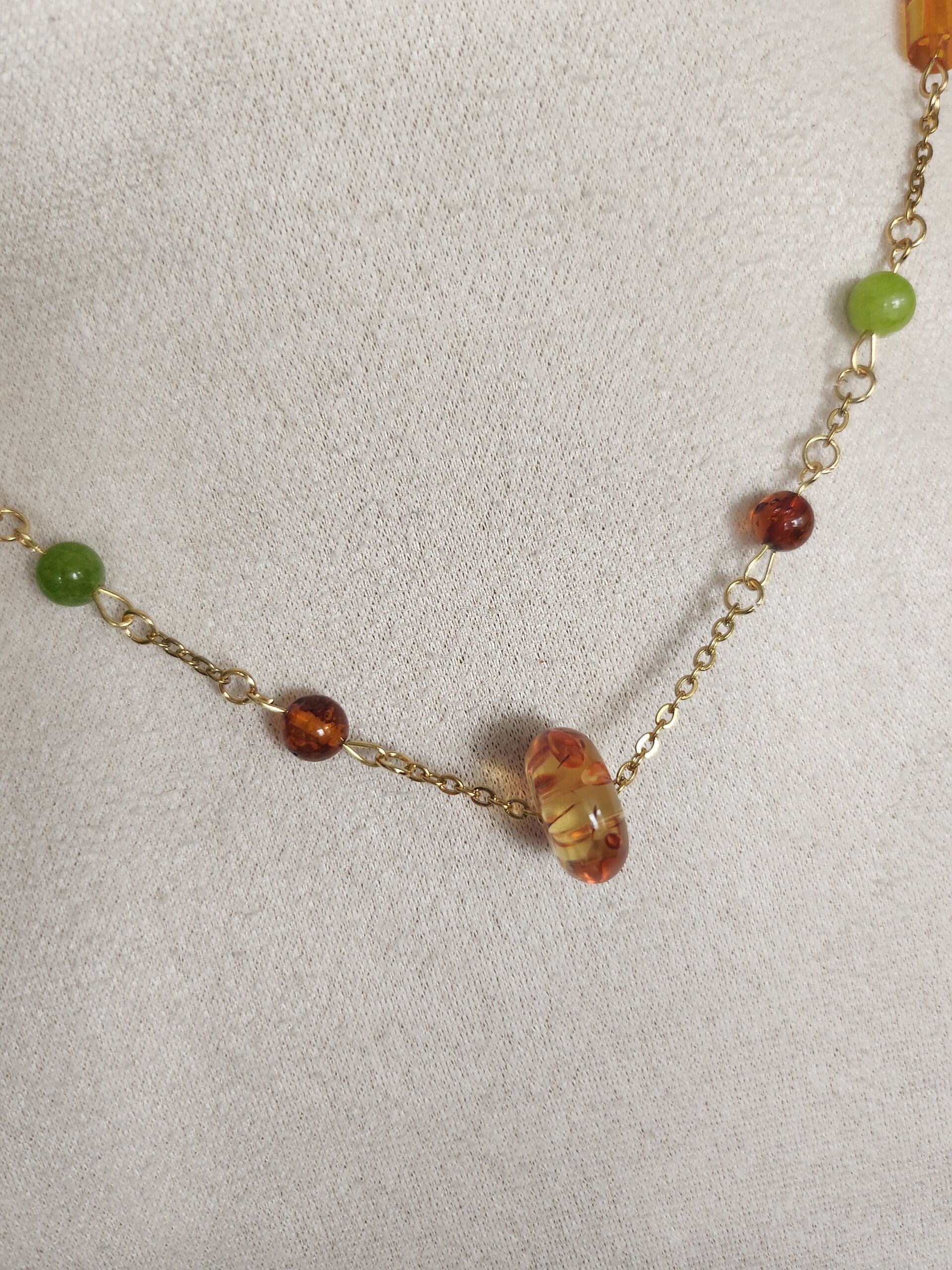 Collier et ses perles naturelles 🌹 [ peridot, ambre], chaîne en acier inoxydable 304 doré , fait main, "valy's Jewelry "