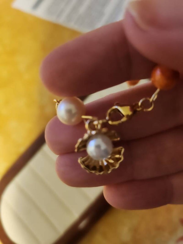 Ravissant bracelet en pierres naturelles 🌹, [ jade corail, perles de culture d'eau douce, Couleur crème. ], anneaux et tiges en acier inoxydable 304 doré , charm " Coquillage et perle de culture , fait main, VALY'S JEWELRY 🦋