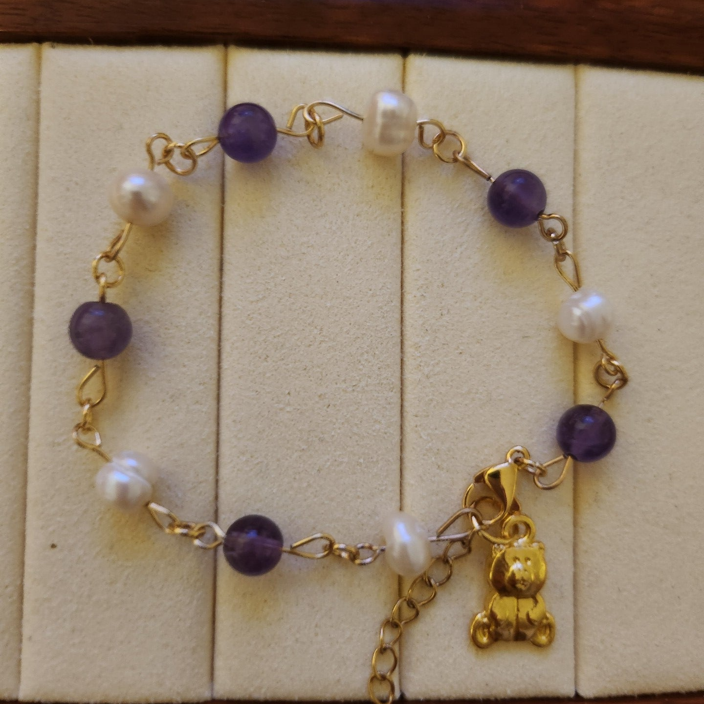 Ravissant bracelet en pierres naturelles 🌹, [ perles d'eau douce blanche, améthyste ], anneaux et tiges en acier inoxydable 304 doré , charm " ourson" , fait main, VALY'S JEWELRY 🦋
