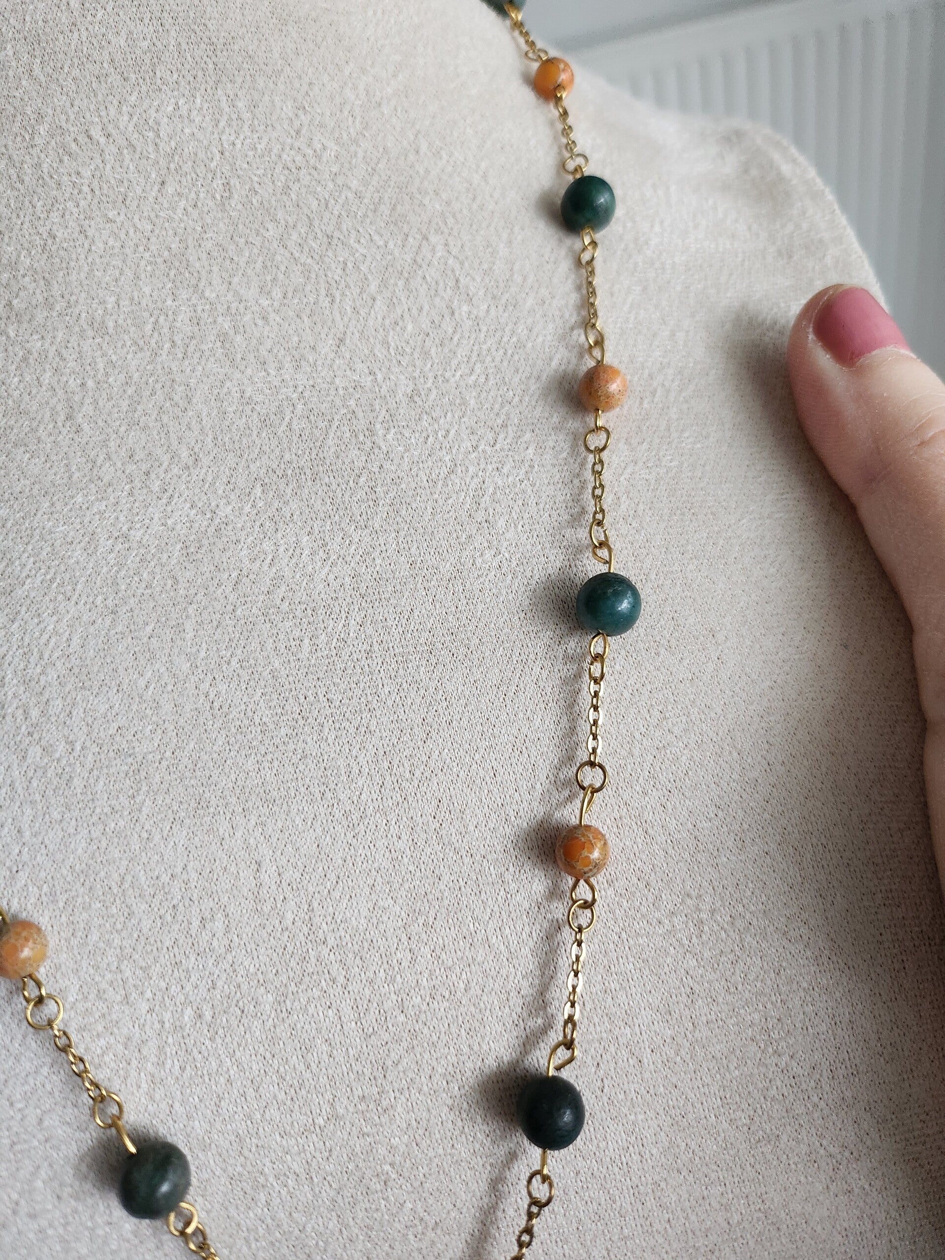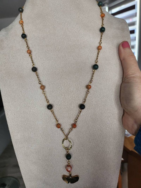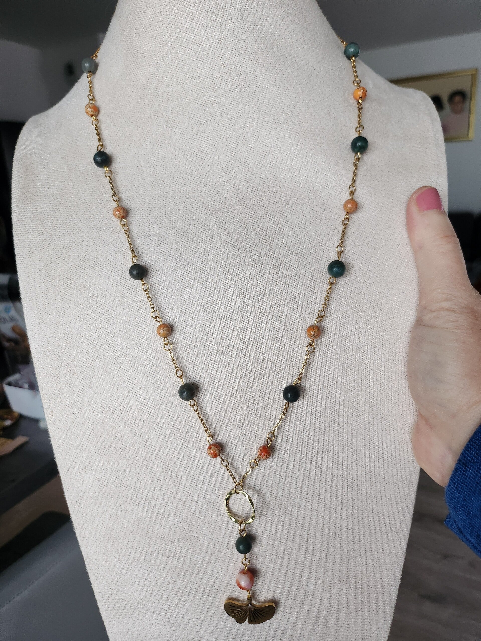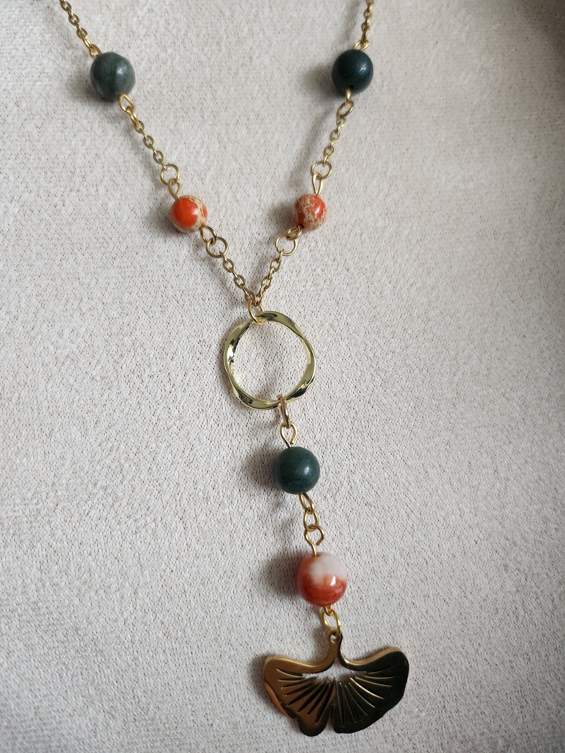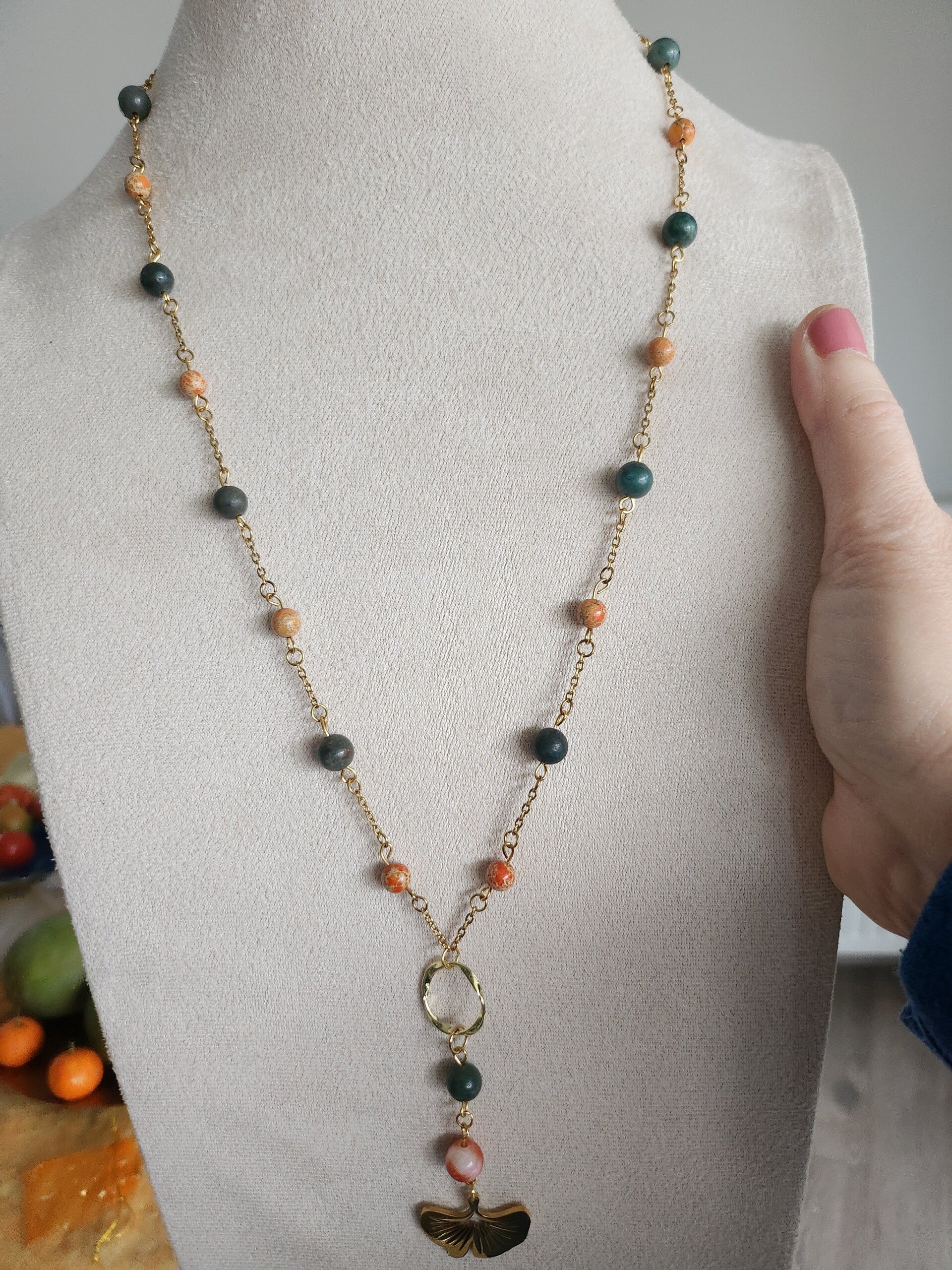 Collier-sautoir en pierres naturelles , [ chrysocolle, jaspe orangé, cornaline] ,pendantif motif " feuille de ginkgo" en acier inoxydable doré 304, anneau martelé en acier inoxydable doré, chaîne en acier inoxydable doré 304🌹, fait main, Valy's Jewelry 🌺