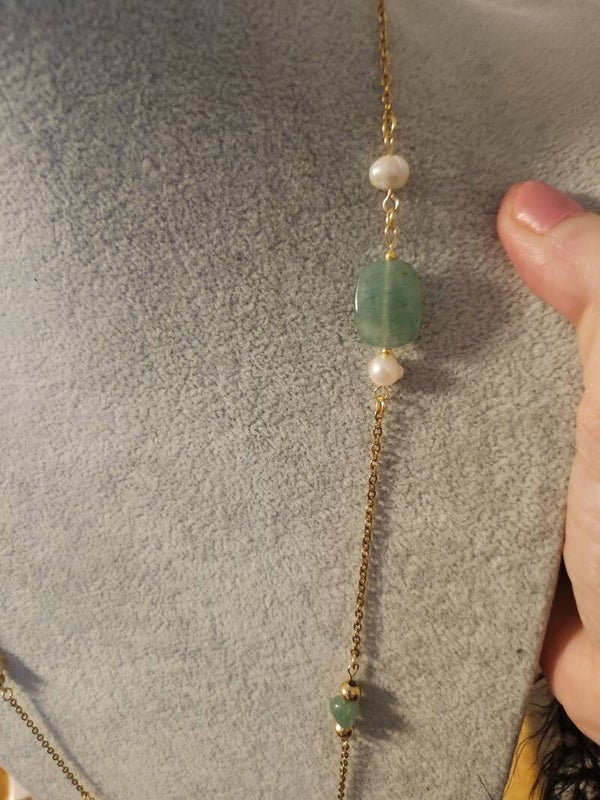 Collier-sautoir en pierres naturelles , [ nacre, perle de culture d'eau douce, aventurine verte] , perles en acier inoxydable Doré, chaîne en acier inoxydable doré 304🌹, fait main, Valy's Jewelry 🌺