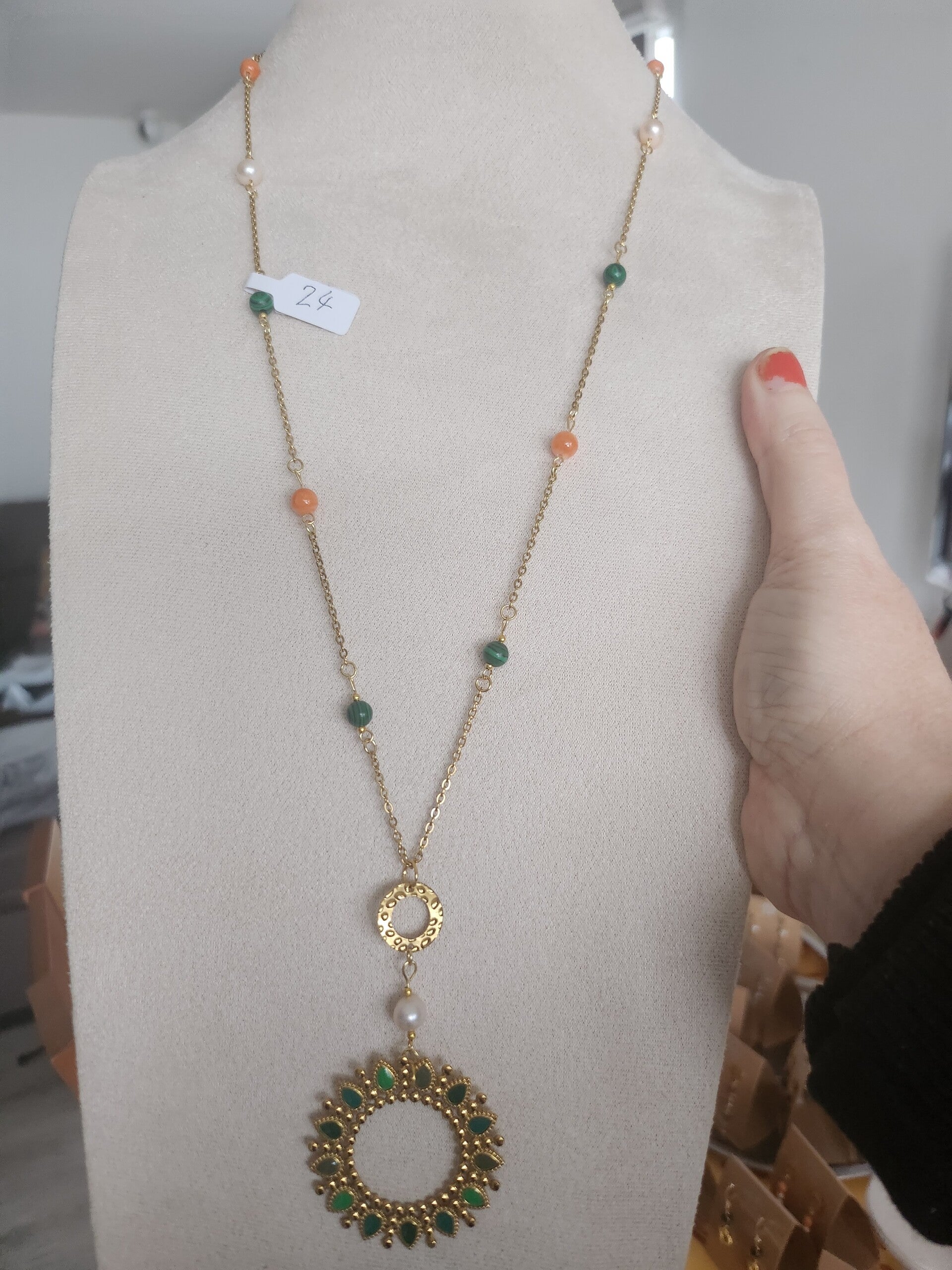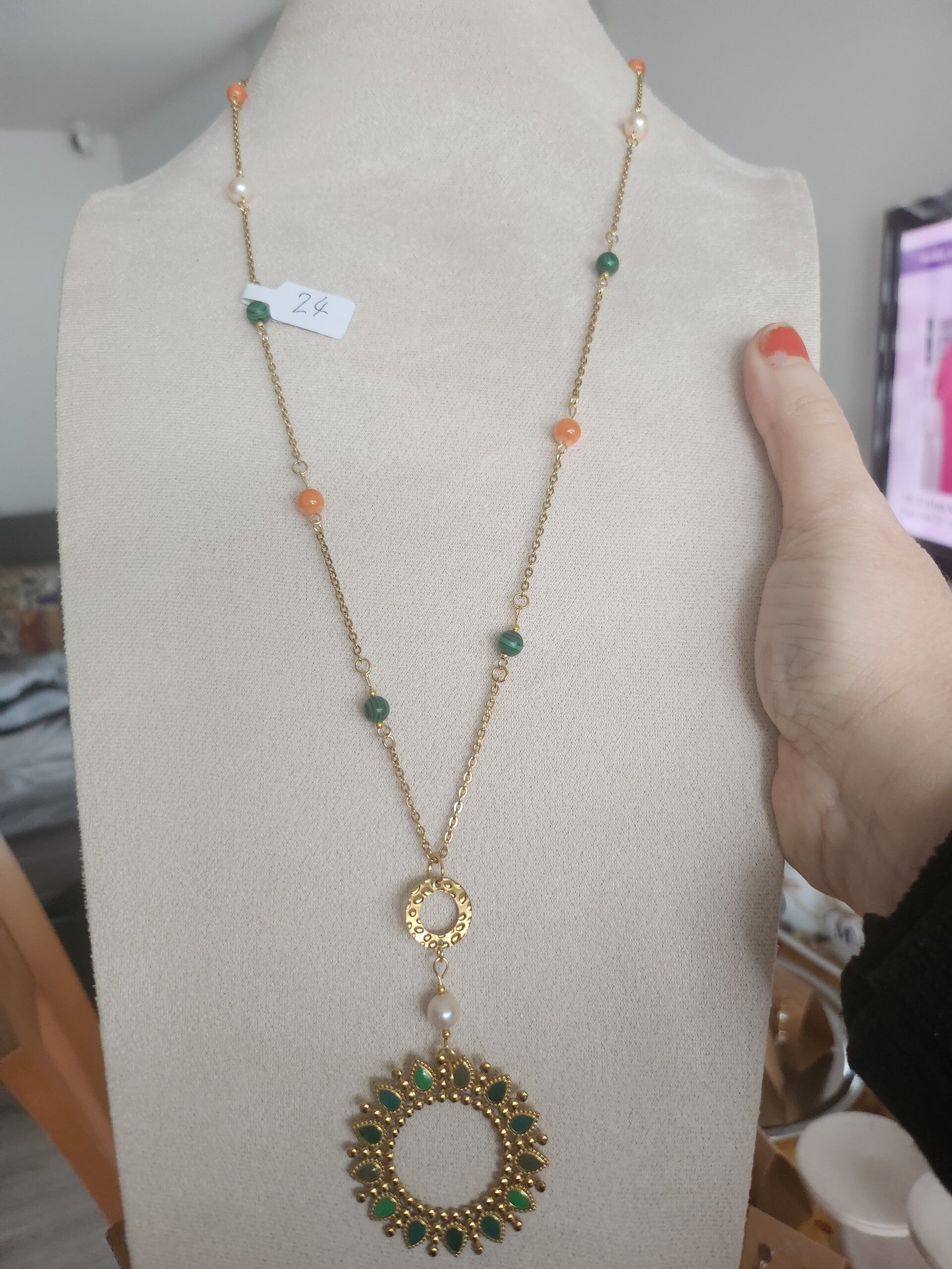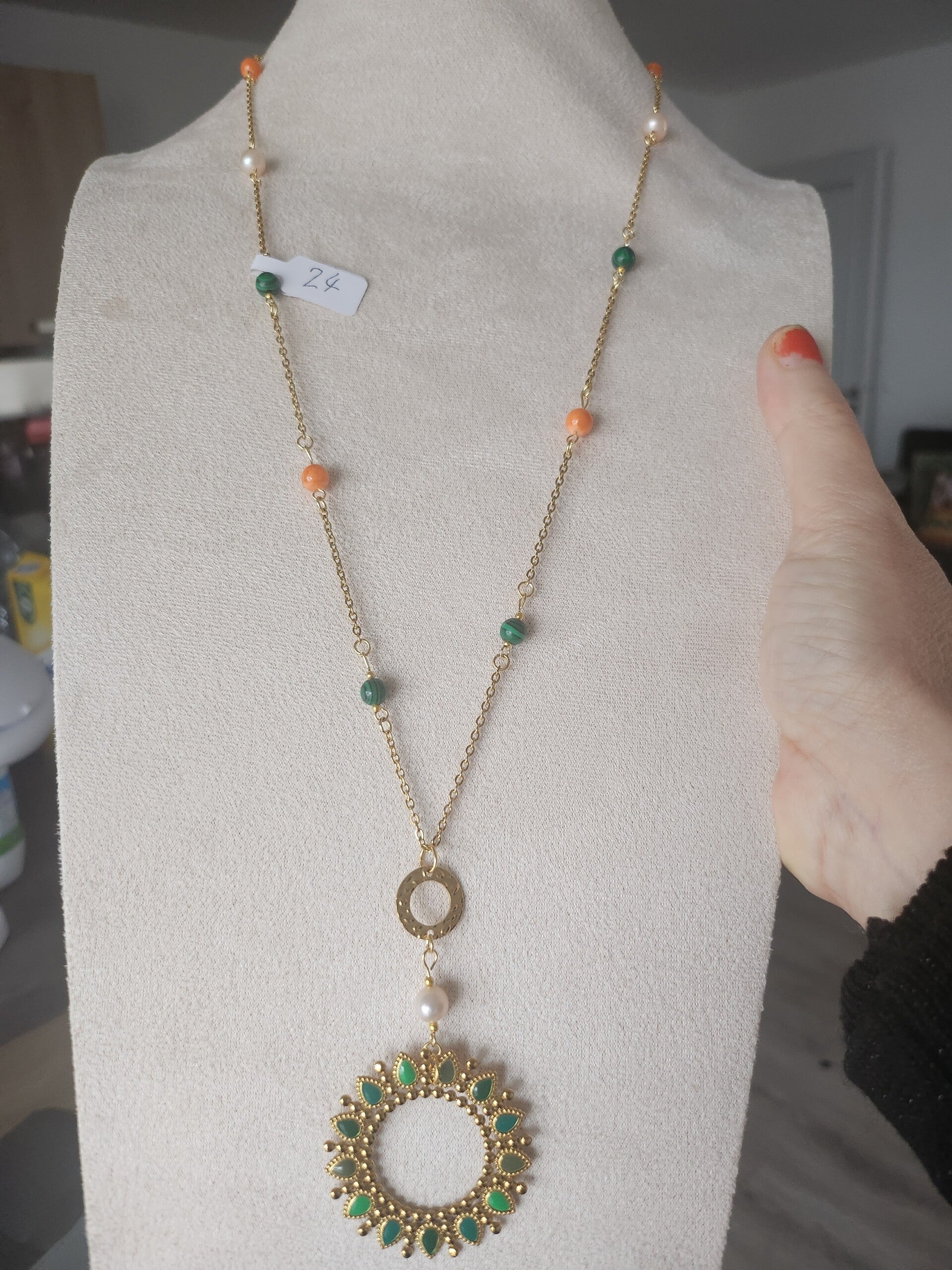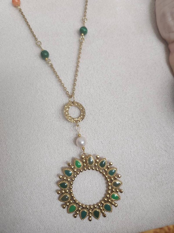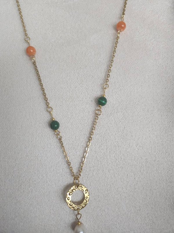 Collier-sautoir en pierres naturelles , [ malachite, jade corail, perles de culture d'eau douce irisée] , pendantif motif " soleil" en acier inoxydable doré 304, anneau martelé en acier inoxydable doré, chaîne en acier inoxydable doré 304🌹, fait main, Valy's Jewelry 🌺
