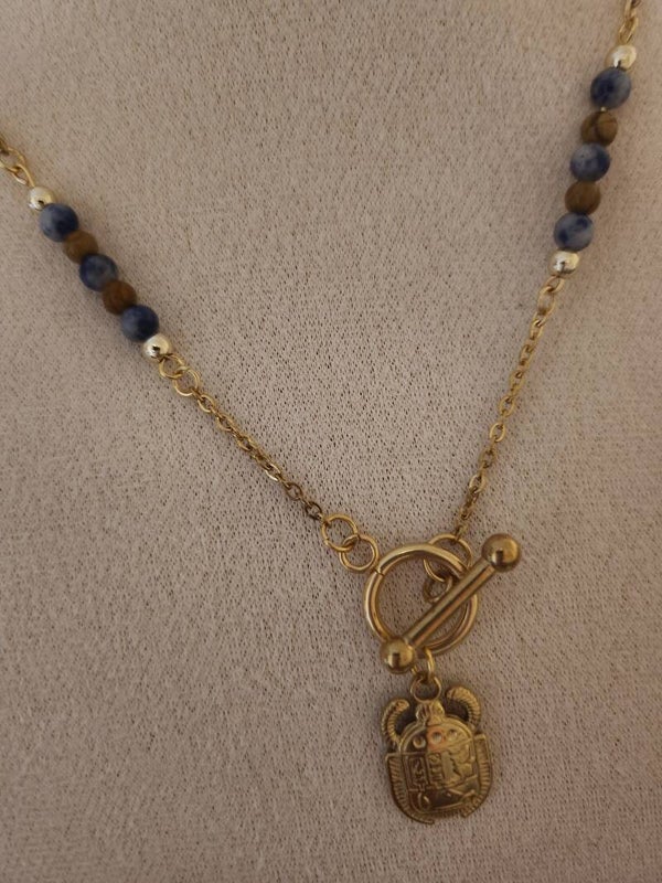 Collier en pierres naturelles, collection " Terres colorées" , [ sodalite, jade , perles de culture d'eau douce], perles en acier inoxydable doré, fermoir en T à l'avant, pendentif " scarabée " , en acier inoxydable doré